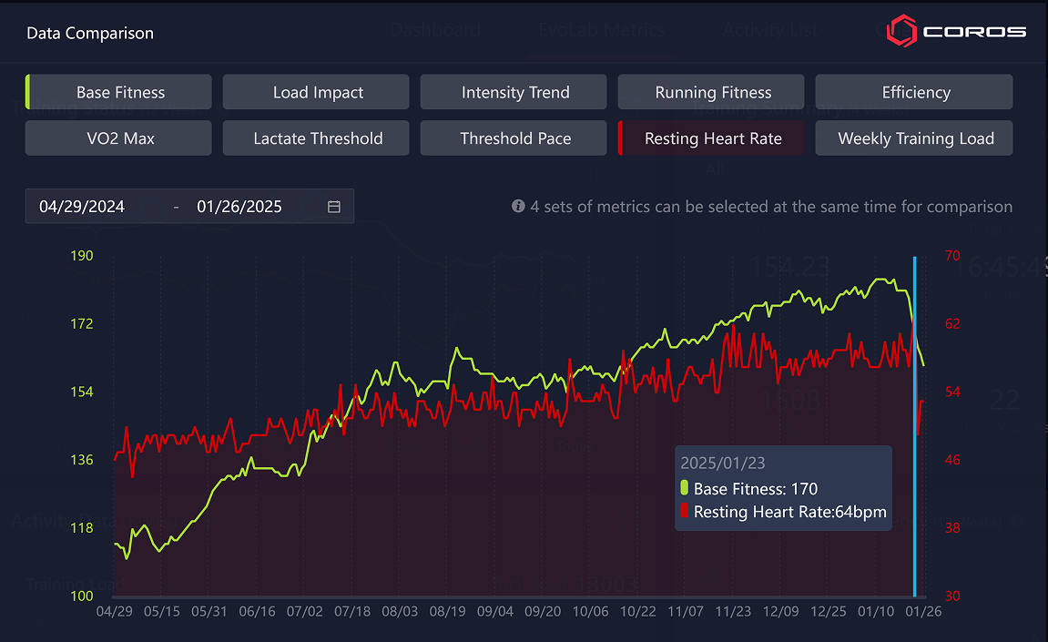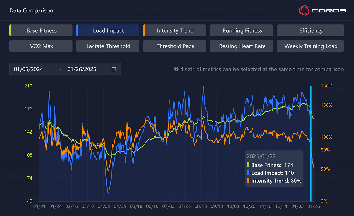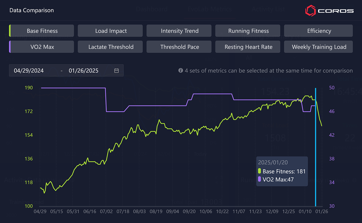 Ha a COROS Training Hub által kínált grafikonok különböző értékeire összpontosítunk, világosan megfigyelhetjük az egész folyamatot az idő múlásával. Ha megnézzük az edzésterhelés grafikonját az első trimeszteremben: május közepétől július közepéig, akkor világosan láthatjuk, hogy mind a terhelés, mind a fittség csökken. Ez normális és kívánatos. Általában van néhány hét "pihenés", de a mozgás leállítása nélkül.